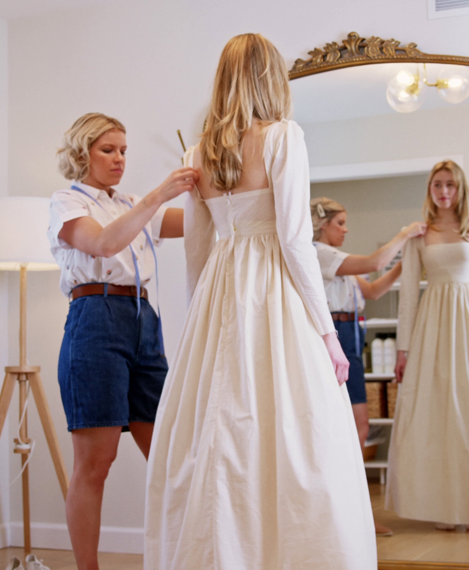 To ensure the most refined fit, a carefully constructed mock garment is created using cotton muslin. This preliminary version mirrors the silhouette and structure of your final gown. During this fitting, Sarah will tailor every detail to perfection and accommodate any design refinements before cutting into your chosen fabric.