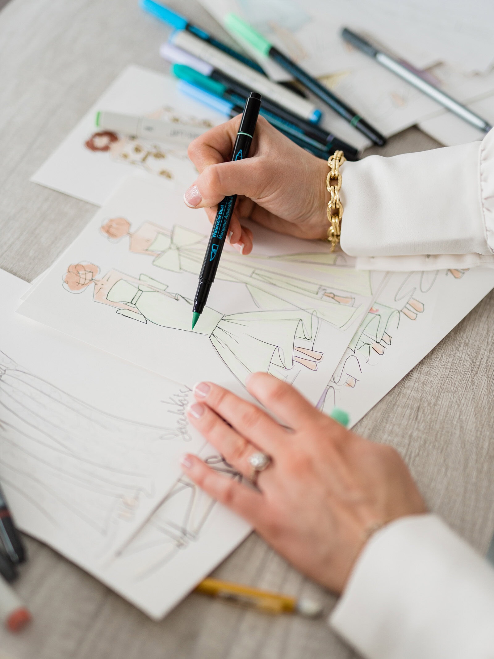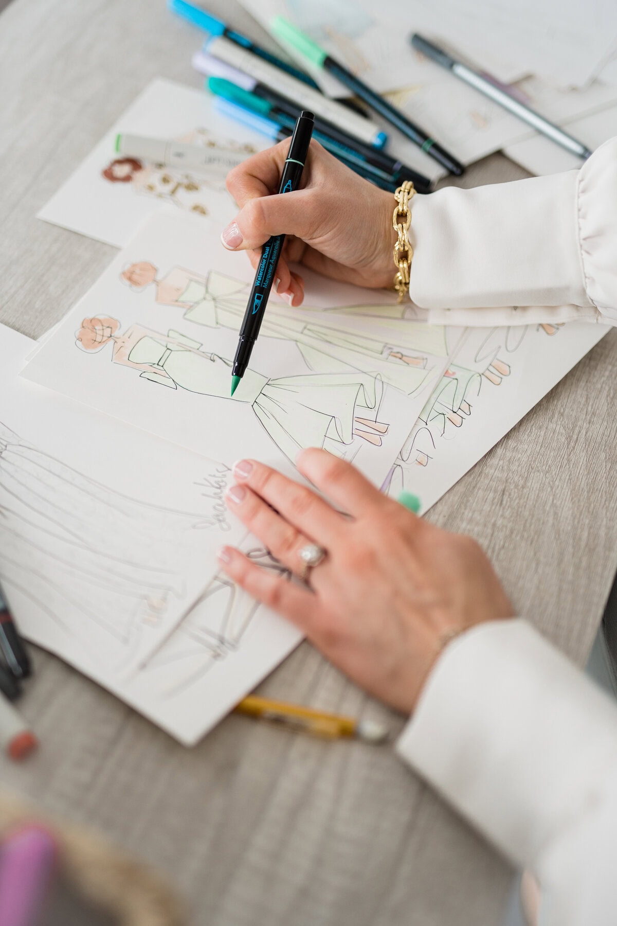 Your couture journey begins with an inspired collaboration—where color palettes, luxurious silk fabrics, and design direction are thoughtfully curated to bring your vision to life. Precise measurements are taken, and custom patterns are developed as the foundation of your bespoke gown!