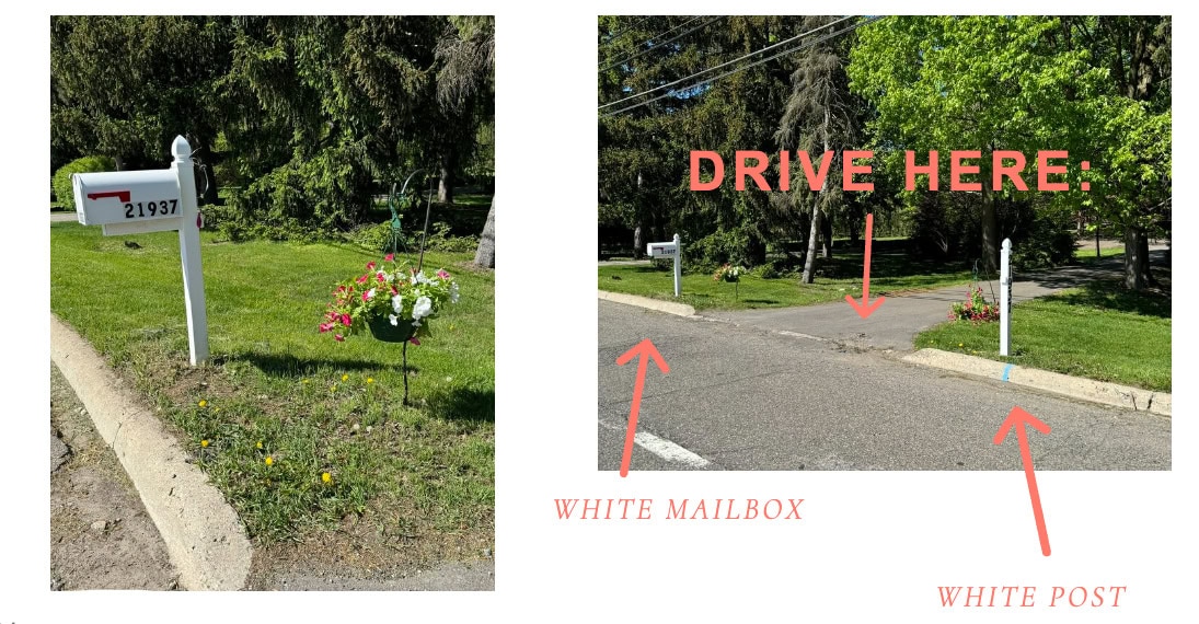 FYI her neighbor’s house has a similar entrance so please verify you have the correct address before driving up the driveway. You will see Sarah’s mailbox before you see her house, here is a photo of Sarah’s mailbox to give you a visual!